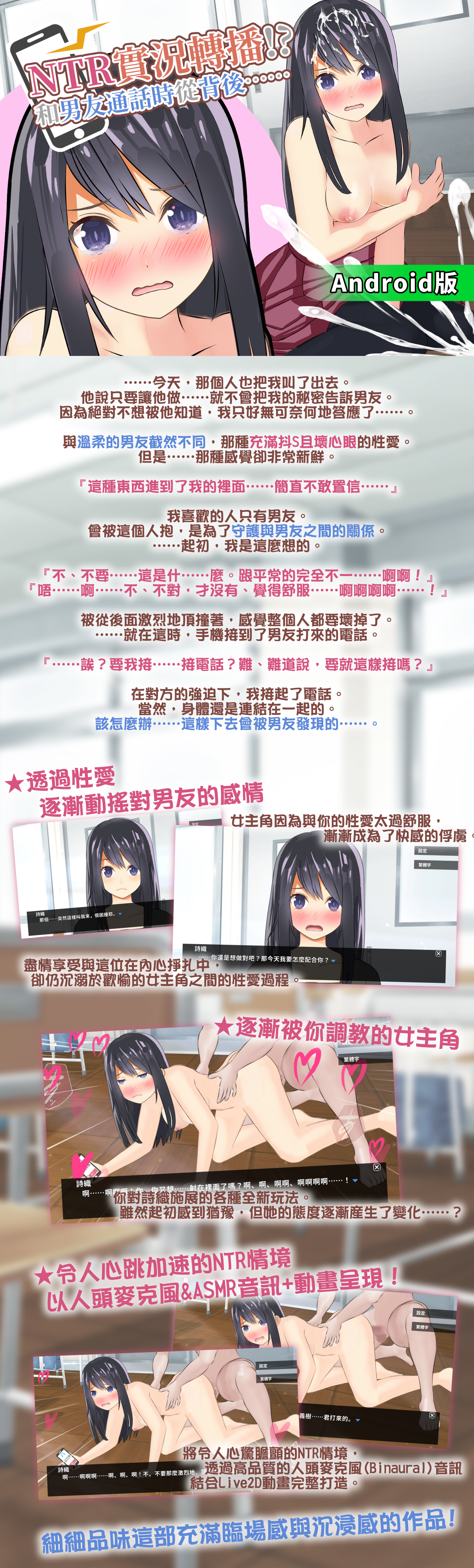 《NTR実況中継!?彼氏と電話中に背後から…》 製作社團:ハーフトーンドット 在性愛中逐漸動搖的,對男朋友的感情 因為和你的性愛實在太舒服,女主角漸漸沉溺其中。 一邊掙扎、一邊墮入快感深淵的女主角,與她的性愛體驗,請盡情享受。 ※內含特典ASMR