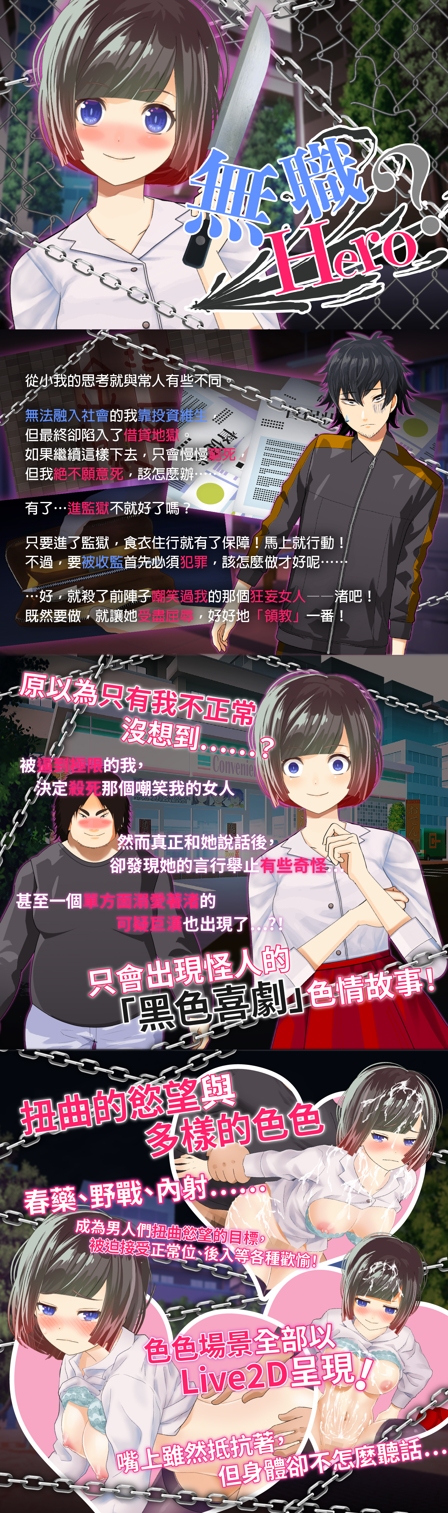 《ムショクHero》製作社團:ハーフトーンドット "...要好好讓那個小看我的女人明白我不是好惹的……!" 原本打算殺掉的渚,卻在相遇時讓主角內心掀起巨大矛盾。 接著發生了意想不到的展開。 而那時,他所做出的選擇是──?
