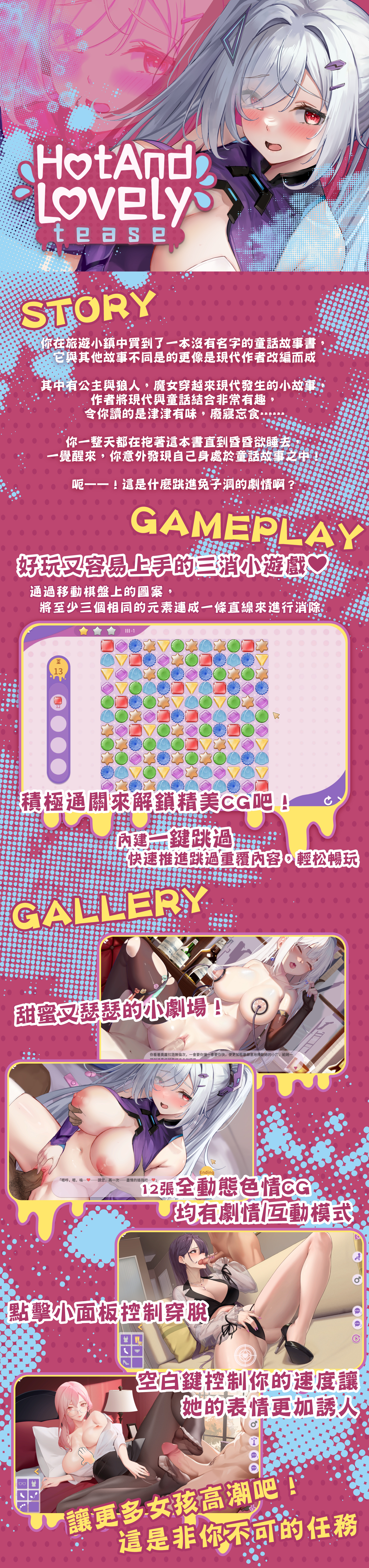 《Hot And Lovely :Tease》 製作社團:Lovely Games 是一款經典消消樂遊戲, 滑動方塊將相同圖案方塊三個及以上相鄰便會消除, 將特定方塊消除完畢後即可進入下一關卡。 遊戲操作方便,簡單容易上手, 在這裡你可以體驗傳統三消遊戲的獨特魅力~